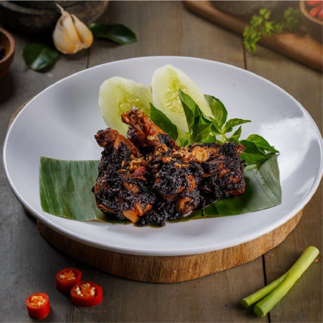 Bebek dibakar dengan arang batok kelapa dibumbui gaya khas Jawa dengan rasa cenderung manis gurih