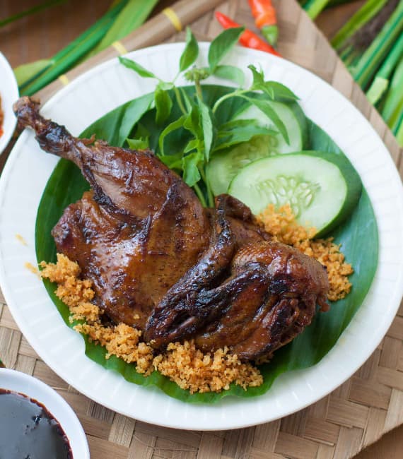 Bebek dibakar dengan arang batok kelapa dibumbui gaya khas Jawa dengan rasa cenderung manis gurih