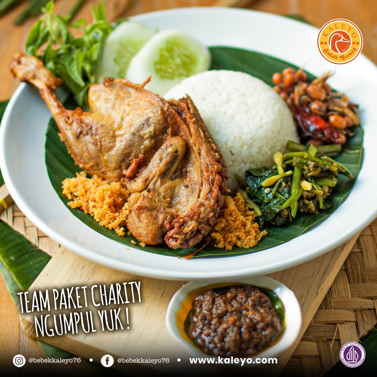 Cari paket makanan yang bikin kenyang dan puas? Bebek Kaleyo punya solusinya! Dengan Paket Charity, kamu bisa nikmati bebek muda goreng yang juicy, tumis sang buaya yang nikmat, teri kacang gurih, sambal cetar, kremesan yang crunchy, lalapan segar, dan nasi hangat. Banyak isian, rasa juara, dan pastinya bikin perut kenyang. Yuk, pesan sekarang dan rasakan kenikmatannya!