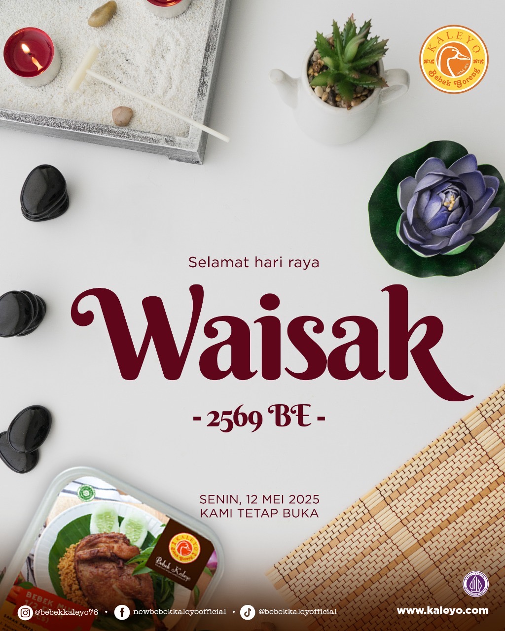 Selamat Hari Raya Waisak 2569 BE/2025 M bagi yang merayakan. Semoga cahaya kebijaksanaan dan kedamaian senantiasa menerangi langkah kita semua. Untuk Kaleyo Lovers, Bebek Kaleyo tetap buka pada tanggal 12 Mei 2025! Jangan lupa mampir dan nikmati lezatnya bebek terenak yang bikin kamu ketagihan.