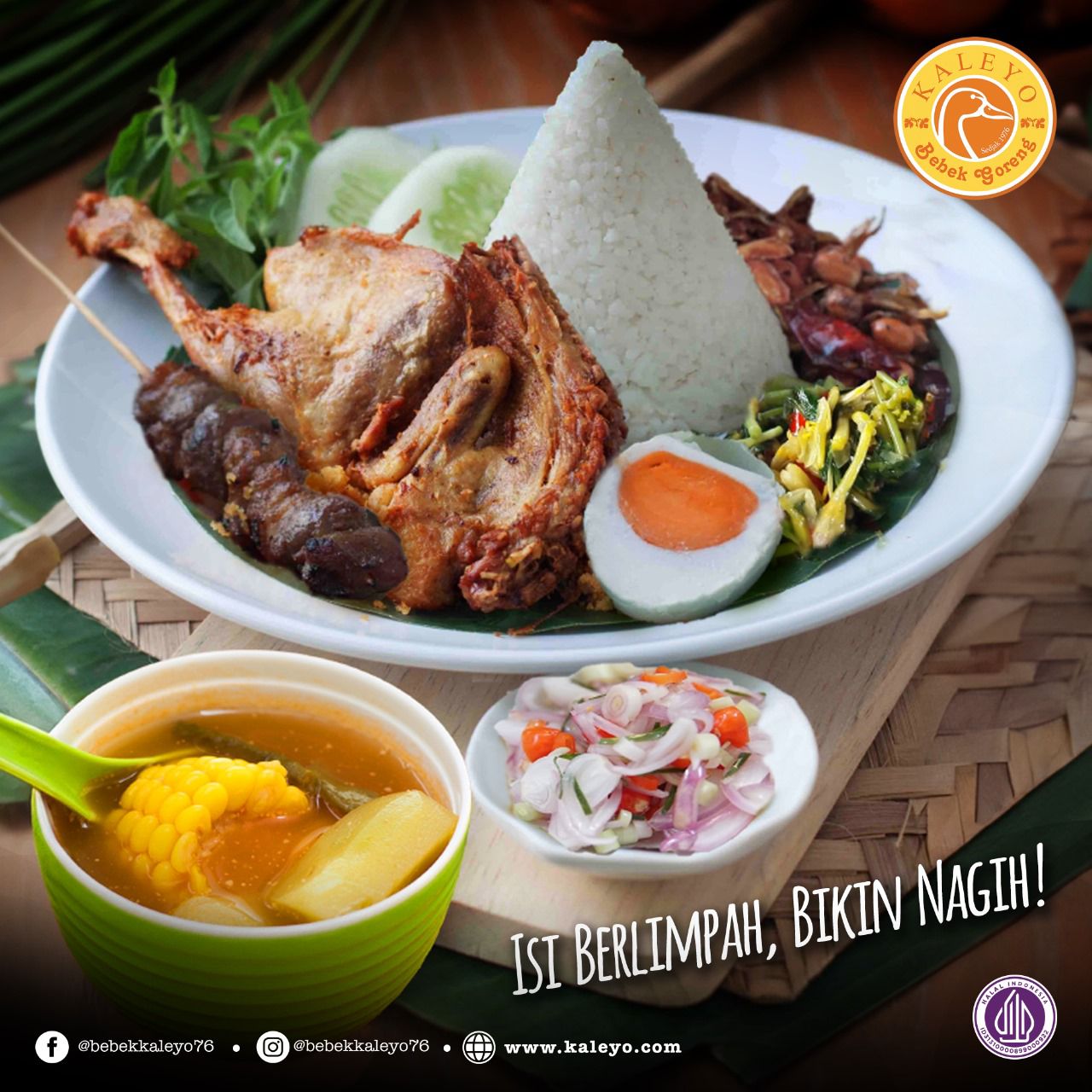 Yuk, cobain nasi campur bebek kami yang super berlimpah ini di Bebek Kaleyo! Dijamin puas dengan nasi, bebek muda 1/2 ekor, sayur asem, lalapan, sambal matah, teri kacang, tumis kangkung, sate bebek, dan telur bebek yang bikin nagih! Langsung pesan sekarang!